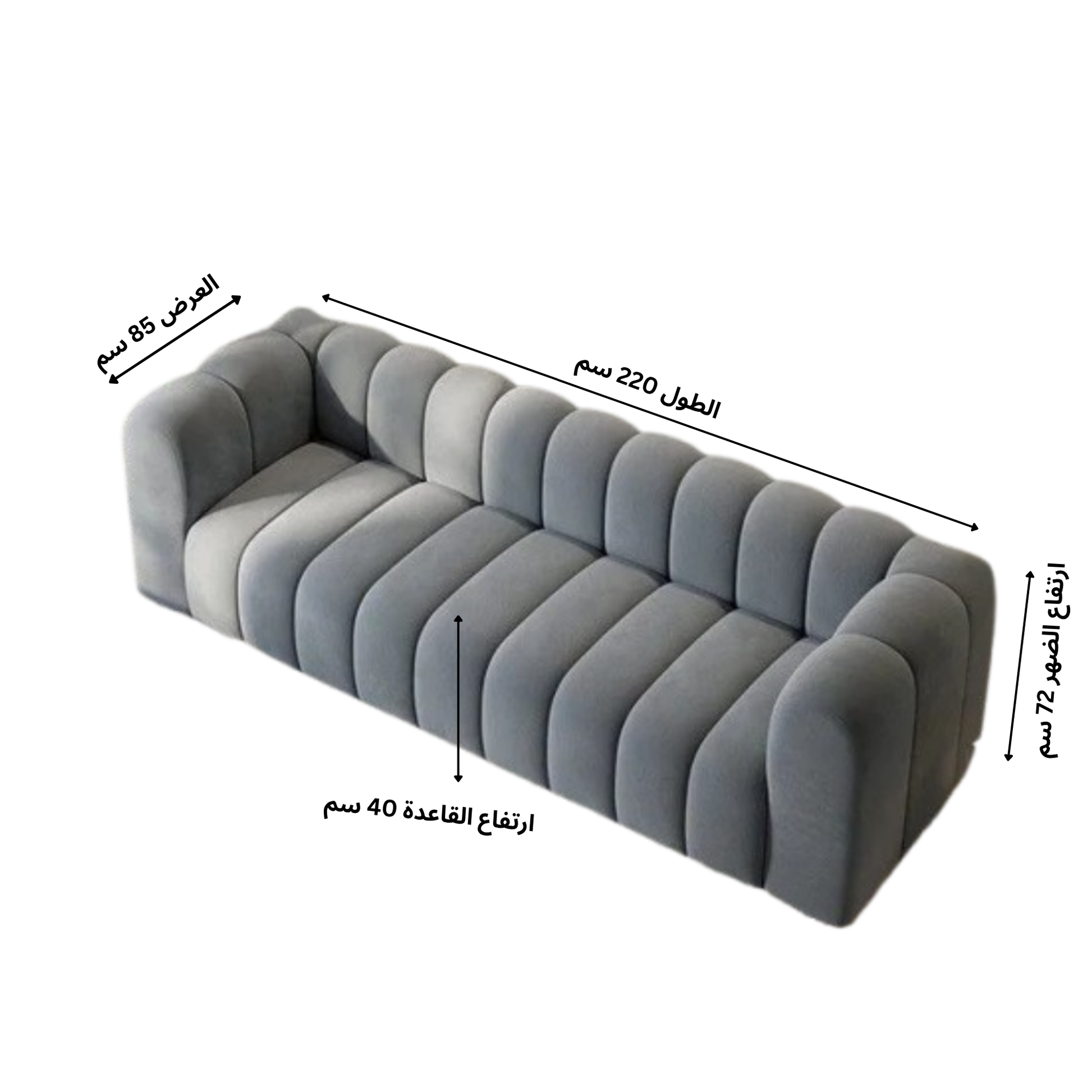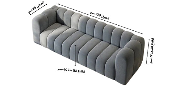 الأبعاد: الطول 220 سم، العرض 85 سم، ارتفاع القاعدة 40 سم، ارتفاع الظهر 72 سم.
